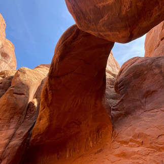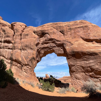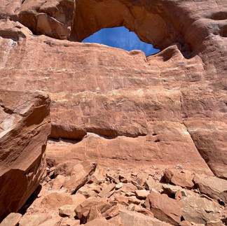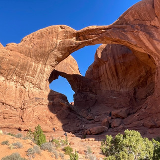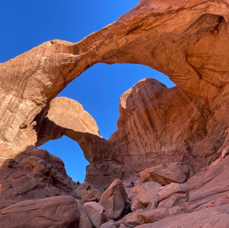 I began in the area called "The Windows" which is 12 miles north of the visitor center. First you see north window and then a little further along you realize there's another arch connected to it: South Window. I opted to take what's called the "primitive path" back around the arches on a trail that is not maintained or well marked, and required some climbing and scrambling. Tougher trsils are a great way to get away from the crowds, and I had this trail all to myself! I ended up getting lost (literature says you are likely to because the trail is so poorly marked) but found my way back around and walked down to the lower parking lot to Double Arch. This is a unique feature in the park where from one base 2 arches at about a 90° angle emerge. I hiked up into one of the arches and that's the cover photo for today's blog (yes, it was way harder to get up to that photo spot than you would think!) From that vantage point it was also a great shot to take a picture through the arch of the beautiful landscape in the distance.